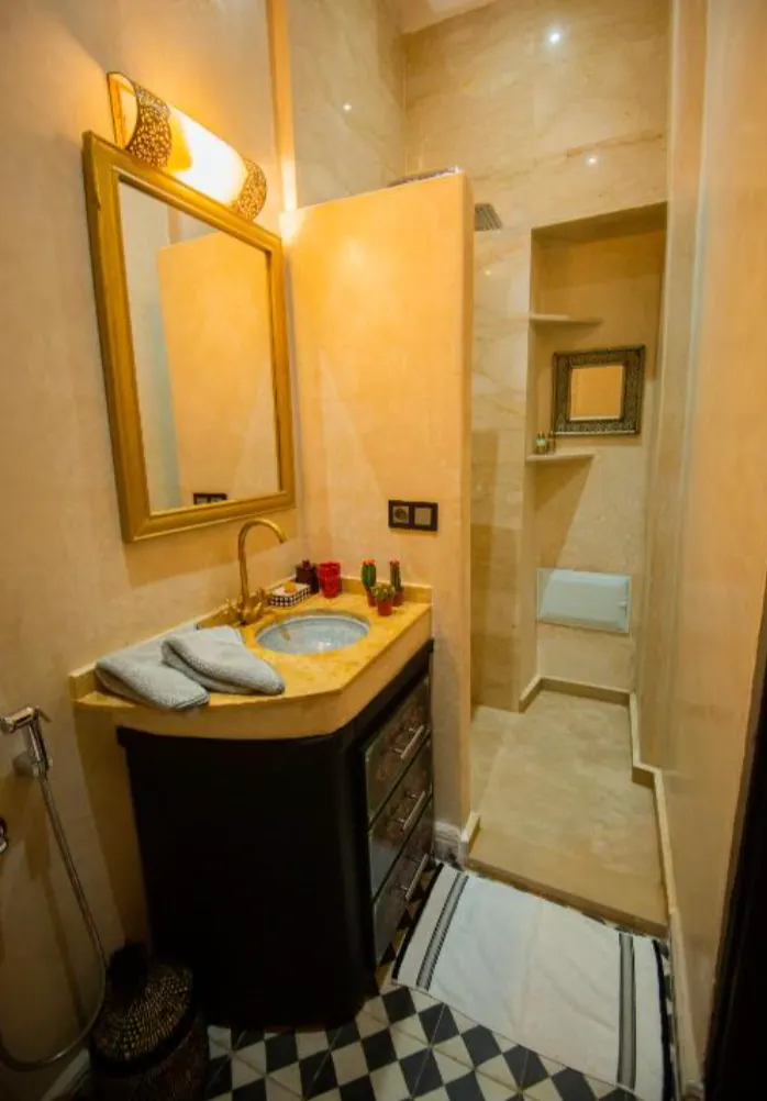 A spacious room decorated with traditional Berber furniture made of painted cedar, located on the first floor of the riad. It faces directly south, making it very sunny. The bathroom is finished in tadelakt.