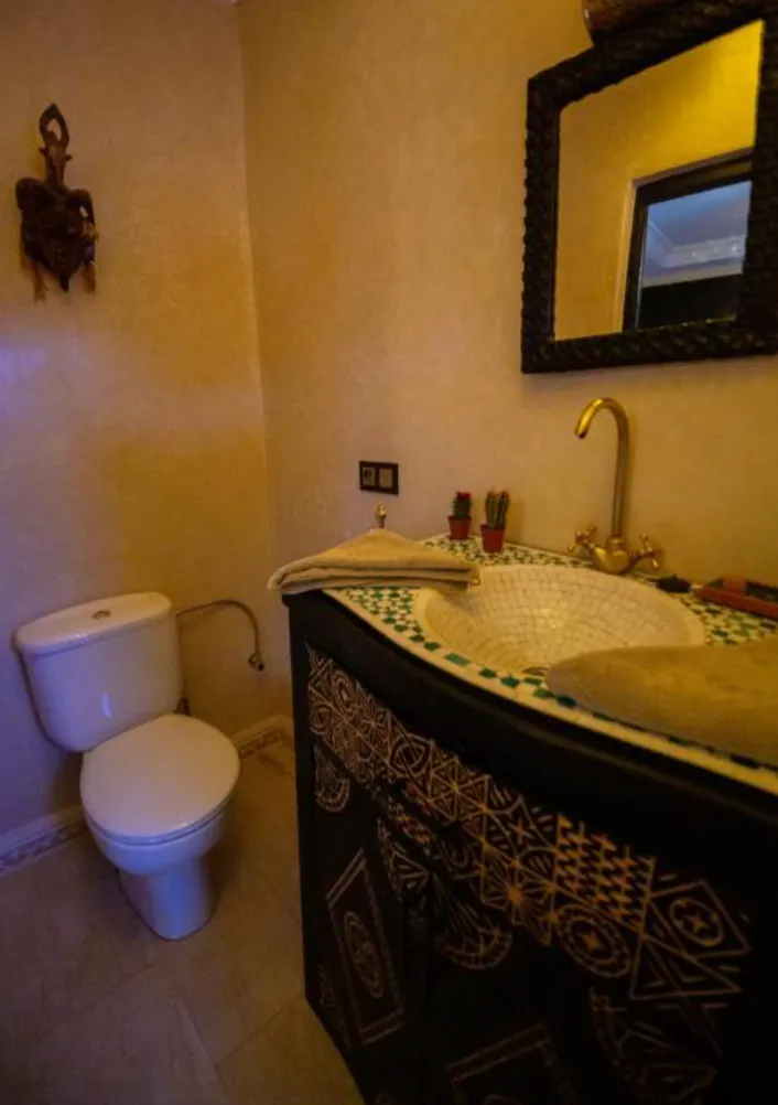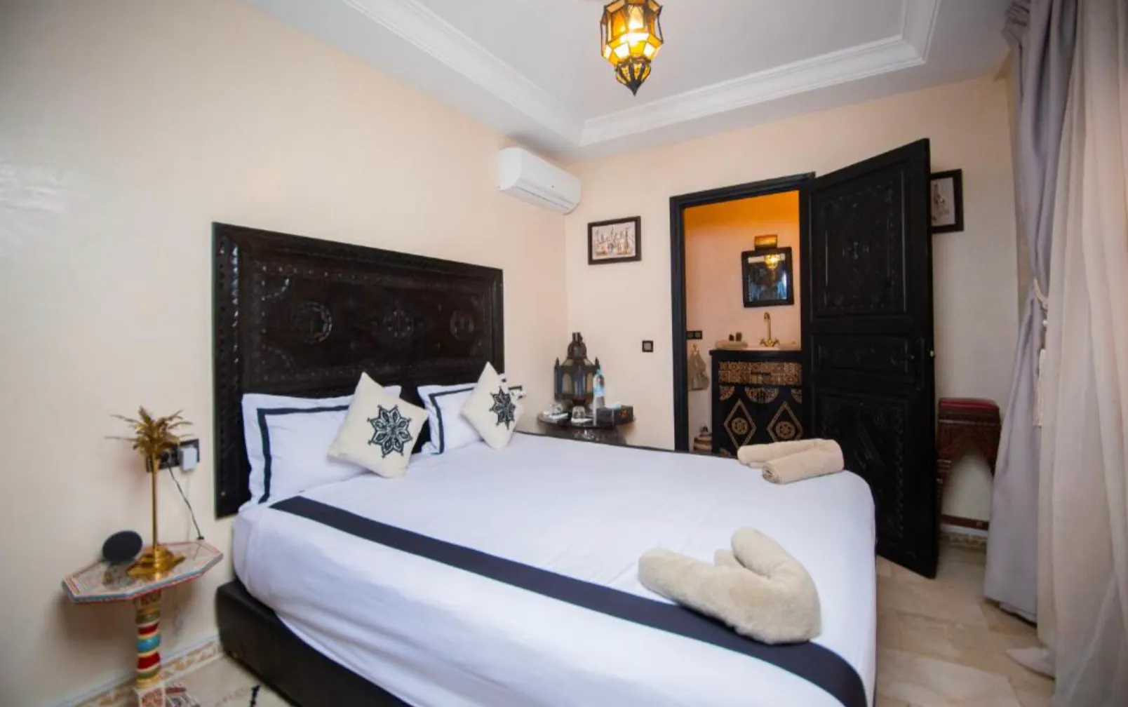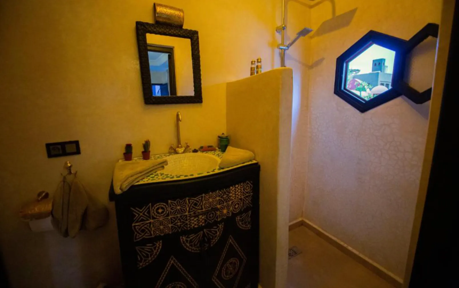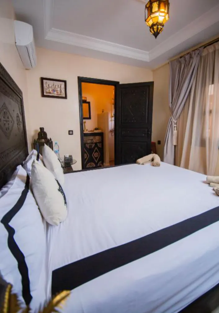 This spacious room, located on the ground floor of the riad, is adorned with unique Zouaké cedar furniture, blending traditional craftsmanship with modern comfort. The room features a king-size bed, designed in the style of a Berber tent, creating a warm, intimate ambiance. Equipped with air conditioning, heating, and a private bathroom with a shower and hairdryer, this room ensures a relaxing and comfortable stay.
